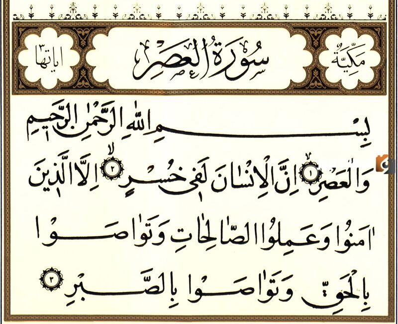 قال الله تعالى في سورة العصر في كتابه الكريم: (وَالْعَصْرِ إِنَّ الْإِنسَانَ لَفِي خُسْرٍ إِلَّا الَّذِينَ آمَنُوا وَعَمِلُوا الصَّالِحَاتِ وَتَوَاصَوْا بِالْحَقِّ وَتَوَاصَوْا بِالصَّبْرِ) صدق الله العظيم.