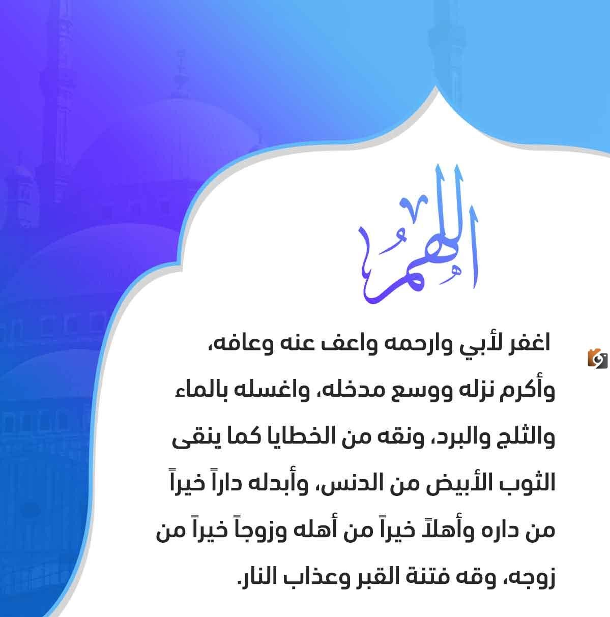 - اللهم إن كان أبى في سرور فزد في سروره ونعيمه، وإن كان في عذاب فنجه وأعفو عنه برحمتك يا رحيم.
