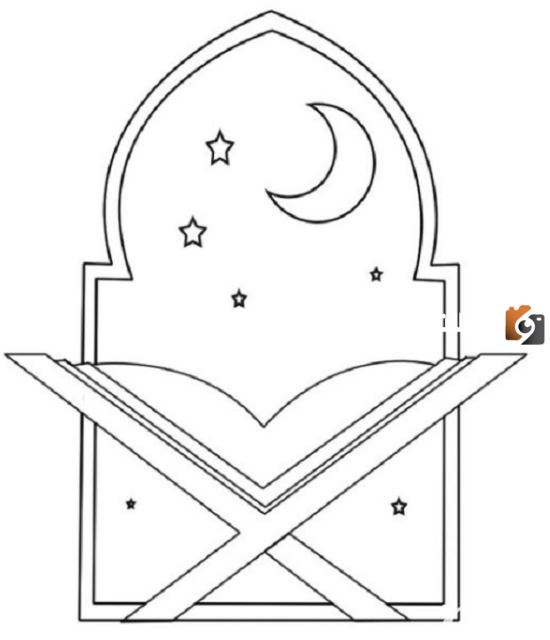 - رسمة جميلة لتعليم الأطفال الالتصاق بالقرآن في الشهر الفضيل والحرص على تلاوته بالليل والنهار لتعظيم الاجر والثواب في أيام و ليالي رمضان، ويمكنك استخدام الألوان الزرقاء والبنية والبيج واللون الذهبي والفضي أيضا لتلوين الرسمة استخدم اللون الأزرق للمصحف من الخارج واللون البيج لاوراق المصحف واستخدم اللون الذهبي للنجمة والفضي للهلال واستخدم اللون البني لتلوين حامل المصحف.