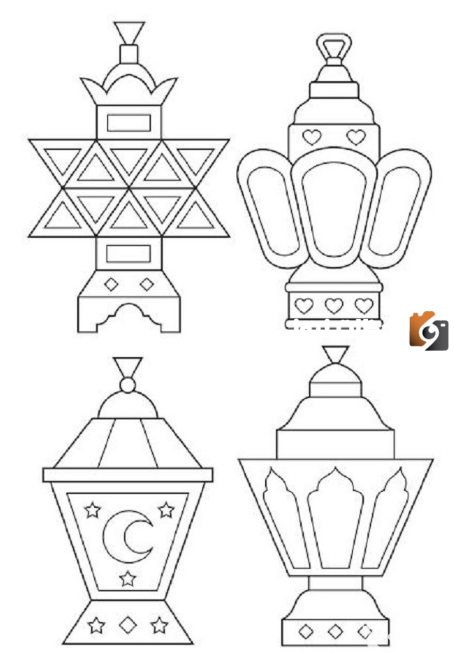 - يحب الأطفال الفوانيس فهي تشعرهم ببهجة الشهر الفضيل، وفي الصورة السابقة مجموعة من رسومات الفوانيس يمكن من خلالها تعليم طفلك الفرق بين الاحجام والاشكال ، كما يمكنك التنوع في استخدام الألوان في الصورة ما بين الأزرق والأخضر والأحمر ، ويمكنك استخدام اللونين الذهبي والفضي لإضافة لمسة من الفخامة على اللوحة.