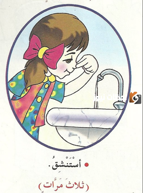 - استنشاق الماء من خلال الأنف 3 مرات باليد اليمنية؛ وإخراج الماء باليسرة.