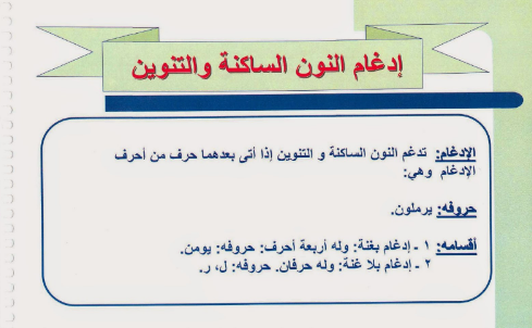 بشرط أن تكون النون الساكنة أو التنوين في نهاية الكلمة الأولى، وأحد حروف الإدغام في الكلمة الثانية، يكون الحكم إدغام، شروط الإدغام أن يكون في كلمتين، وعدم القيام بجمع النون الساكنة مع حروف الإدغام في كلمة واحدة.