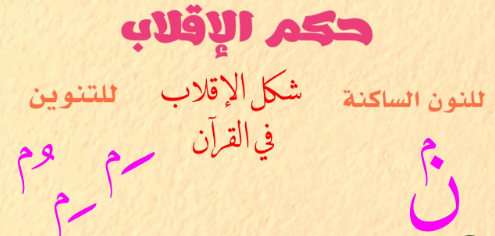 عند يكون كلمتان لا بد من إقلاب حرف النون إلى ميمًا، وسبب الإقلاب تخفيف النطق، لأن يوجد اختلاف في مخرج كل من الباء والنون الساكنة.