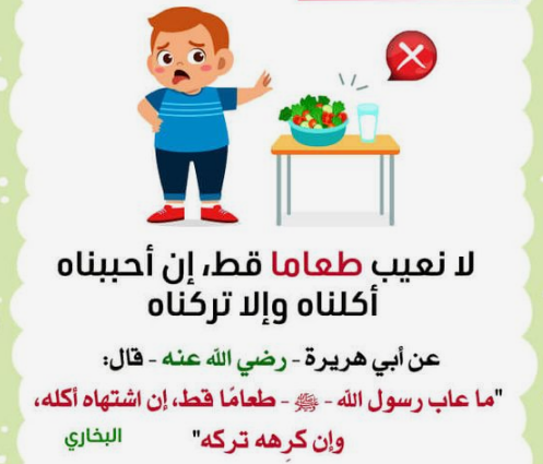 - ألا يعيب المرء على الطعام الموضوع أمامه، ففي حال أعجبه الطعام يجب أن يتناوله وفي حال لم يعجبه يتركه بدون ذمه أو ذكره بالسوء.