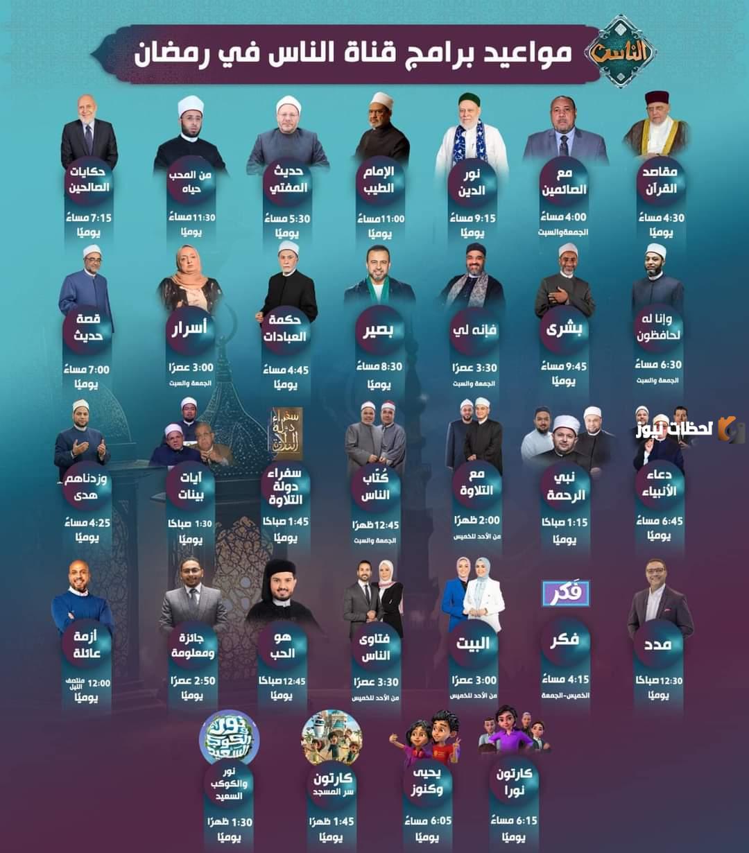 تقوم قناة الناس بعرض مجموعة من البرامج القيمة على مدار ساعات اليوم، وهي برامج دينية مؤثرة وقيمة، وسوف يتم تقديم عدد كبير منها خلال شهر رمضان، وذلك وفقًا للخريطة الزمنية الخاصة بقناة الناس، ومجموعة البرامج التي سيتم عرضها هي كل ما يلي: